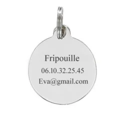 Très originale médaille ronde en acier inoxydable pour chien à personnaliser au verso. Ce pendentif peut être gravé sur 3 lignes avec une gravure offerte. Un amusant motif de « patte » est représenté sur un fond rose pour plus de sympathie. C’est un cadeau très utile et apprécié pour un propriétaire d’animaux domestiques, il plaira à coup sûr ! Faites graver les coordonnées du maître ou de la maîtresse ou tout simplement le nom de l’animal.