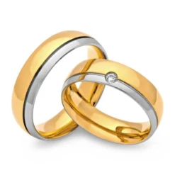 ElĂ©gantes alliances de mariage en acier inoxydable polies avec plaquage or de 5 microns, d’une largeur de 6mm.