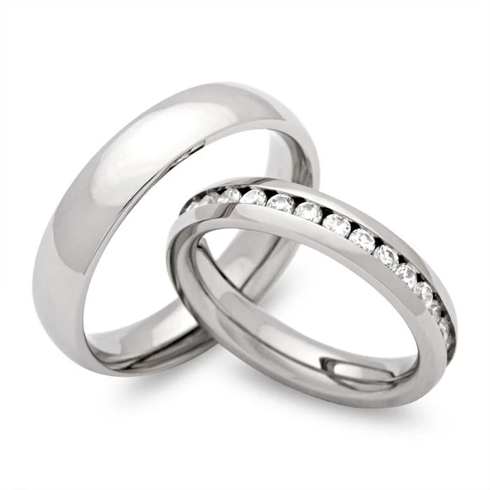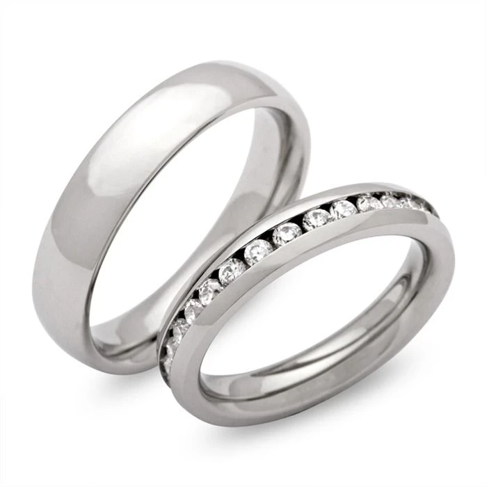 Elégantes alliances de mariage en acier inoxydable. La bague femme est sertie de plusieurs zirkoniums.
