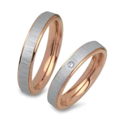 ElĂ©gantes alliances en acier inoxydable mates, intĂ©rieur rosĂ©. La bague femme est ornĂ©e d’un zirconium pour plus de fĂ©minitĂ©. Personnalisez les avec une date et vos prĂ©noms par exemple. La gravure diamant intĂ©rieure est offerte. Gravure diamant ou laser au choix