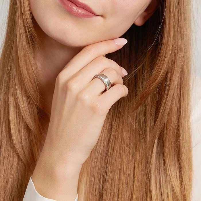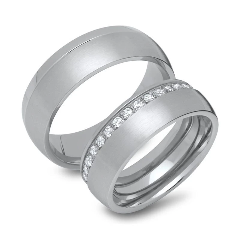 Modernes alliances de mariage en acier inoxydable d’une largeur de 7 mm. La bague femme est sertie de nombreux zirkoniums sur le cotĂ© pour donner encore plus d’Ă©clat au doigt. Personnalisez les avec une date et vos prĂ©noms par exemple. La gravure diamant intĂ©rieure est offerte. Gravure diamant ou laser au choix.
