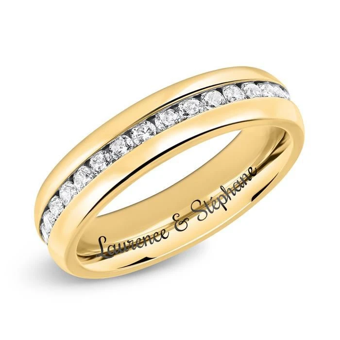 Moderne bague en acier inoxydable avec un lĂ©ger plaquage or et zirkonium. La bague d’une largeur de 4,5 mm est bombĂ©e Ă l’intĂ©rieur pour un plus grand confort. Personnalisez-la avec une date, un prĂ©nom ou encore un symbole grâce Ă la première gravure diamant offerte.