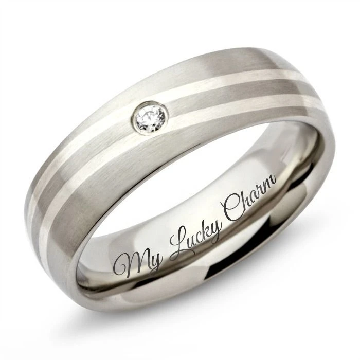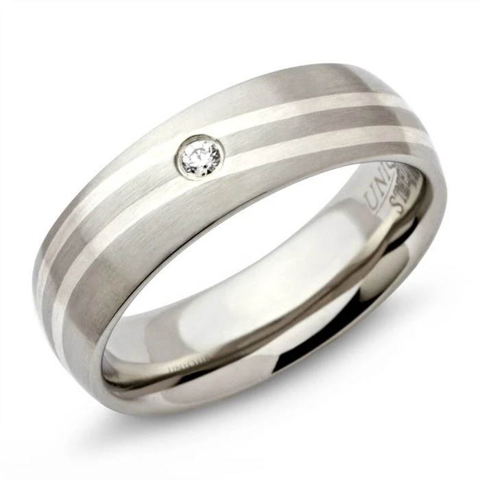 Moderne bague en acier inoxydable avec zirkonium. La bague d’une largeur de 6mm est bombĂ©e Ă l’intĂ©rieur pour un plus grand confort. Personnalisez-la avec une date, un prĂ©nom ou encore un symbole grâce Ă la première gravure diamant offerte.