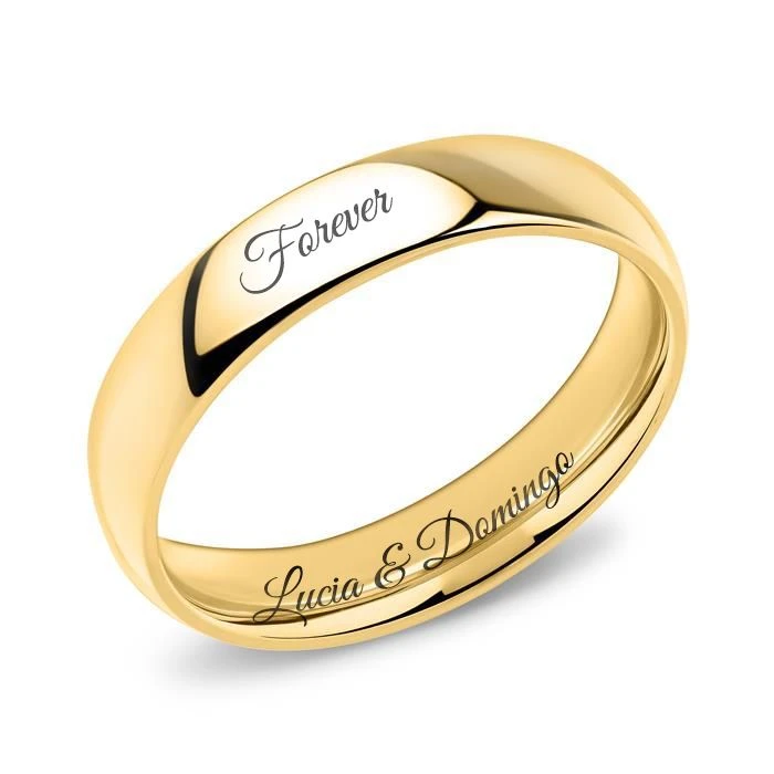 Moderne bague en acier inoxydable dorĂ©e. La bague d’une largeur de 5mm est bombĂ©e Ă l’intĂ©rieur pour un plus grand confort.