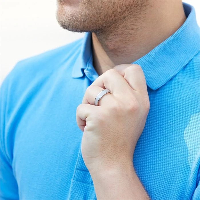 Moderne bague en acier inoxydable. La bague d’une largeur de 6mm est bombĂ©e Ă l’intĂ©rieur pour un plus grand confort.