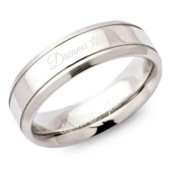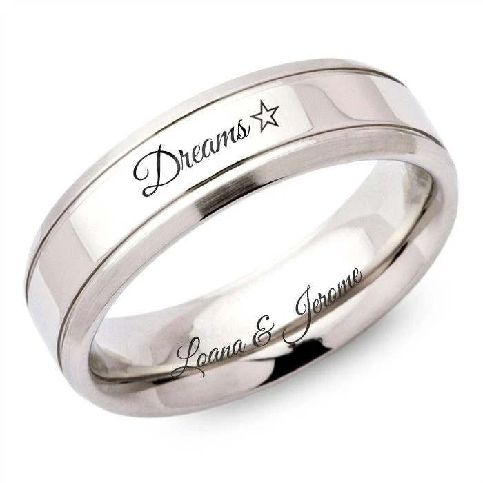 Moderne bague en acier inoxydable. La bague d’une largeur de 6mm est bombĂ©e Ă l’intĂ©rieur pour un plus grand confort. Personnalisez-la avec une date, un prĂ©nom ou encore un symbole grâce Ă la première gravure diamant offerte.