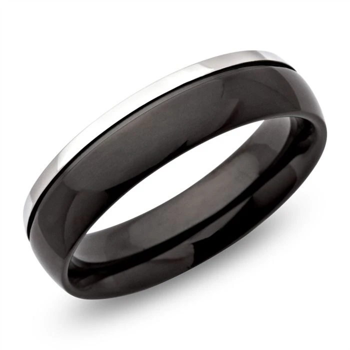 Moderne bague en acier inoxydable avec rangĂ©e noire. La bague d’une largeur de 6mm est bombĂ©e Ă l’intĂ©rieur pour un plus grand confort. Personnalisez-la avec une date, un prĂ©nom ou encore un symbole grâce Ă la première gravure diamant offerte.