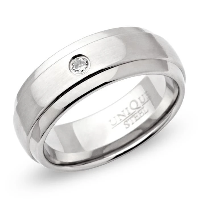 Bague moderne pour femme en acier inoxydable, finition mate et polie, sertie d’un zirconium. Personnalisez-la avec une date ou un prénom à l’intérieur ou à l’extérieur. La première gravure diamant est offerte.