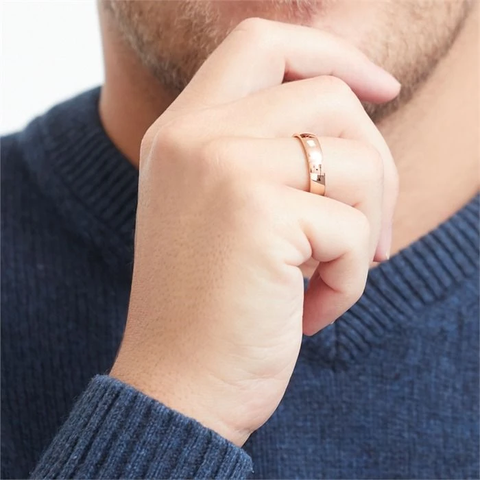 Classique bague en acier inoxydable d’une largeur de 5 mm avec un lĂ©ger plaquage or rosĂ©. La bague est bombĂ©e Ă l’intĂ©rieur pour un plus grand confort. Profitez de la première gravure diamant offerte avec un nom, une date, ou encore un symbole. C’est idĂ©al comme cadeau Ă offrir ou pour se faire plaisir tout simplement.