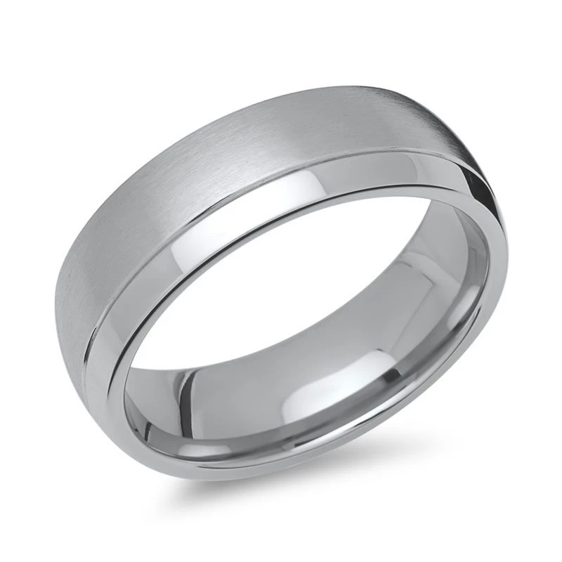 Moderne bague en acier inoxydable avec une rainure sur le cĂ´tĂ©. La bague est bombĂ©e Ă l’intĂ©rieur pour un plus grand confort. Profitez de la première gravure diamant offerte avec un nom, une date, ou encore un symbole.