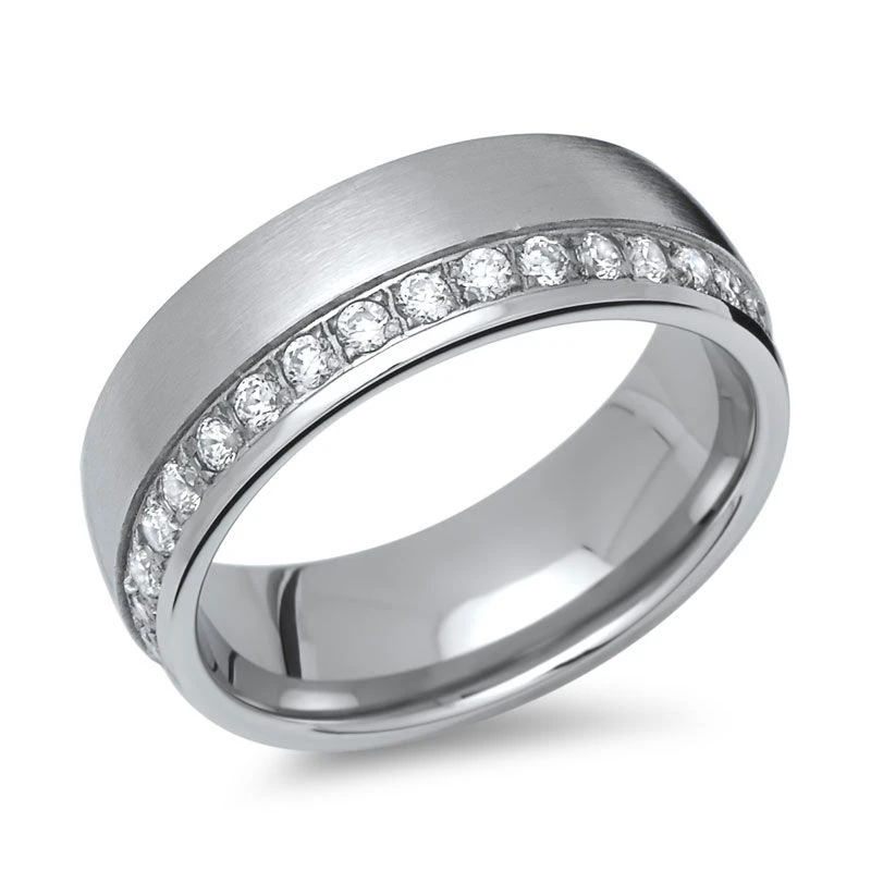 Moderne bague en acier inoxydable, sertie de nombreux zirconiums sur le cĂ´tĂ©. La bague est bombĂ©e Ă l’intĂ©rieur pour un plus grand confort. Profitez de la première gravure diamant offerte avec un nom, une date, ou encore un symbole.