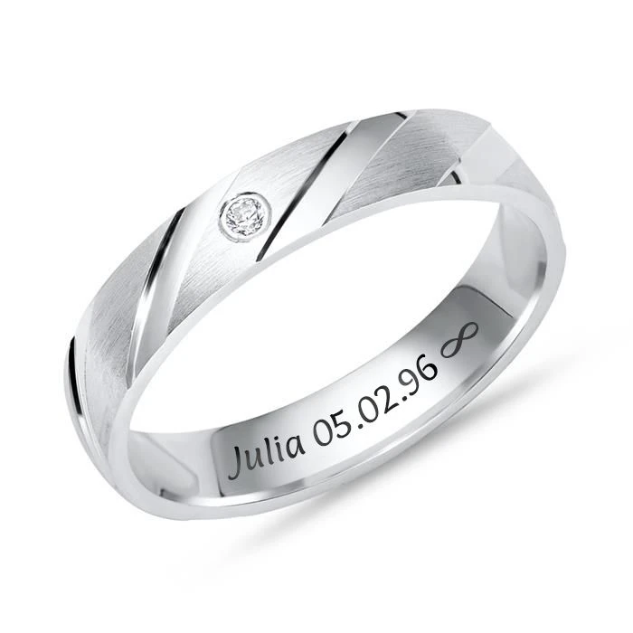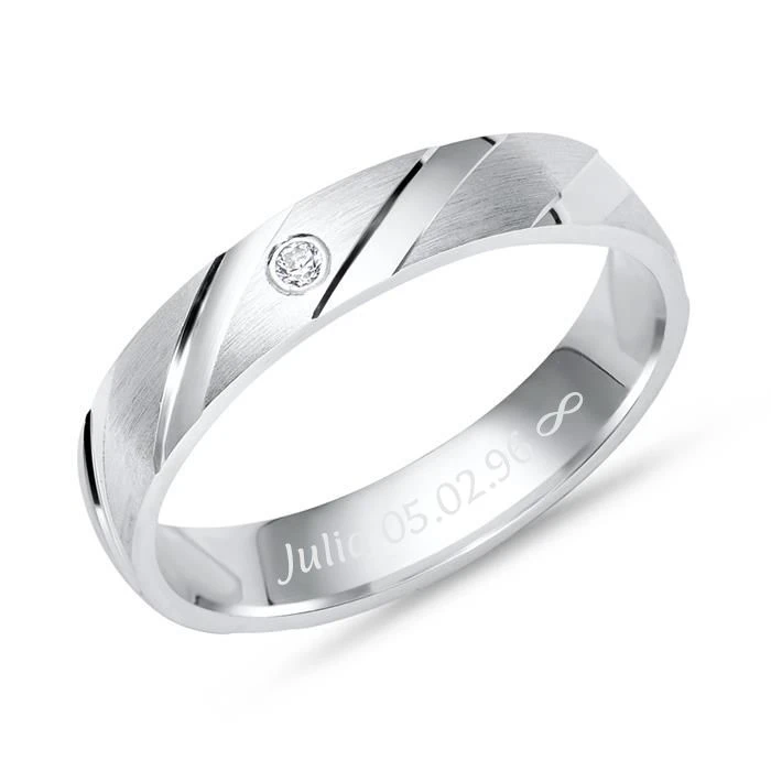 ElĂ©gante bague en argent massif 925 avec un zirkonium. La bague d’une largeur de 3,6 mm est bombĂ©e Ă l’intĂ©rieur pour un plus grand confort. Personnalisez-la avec une date, un prĂ©nom ou encore un symbole grâce Ă la première gravure diamant offerte.