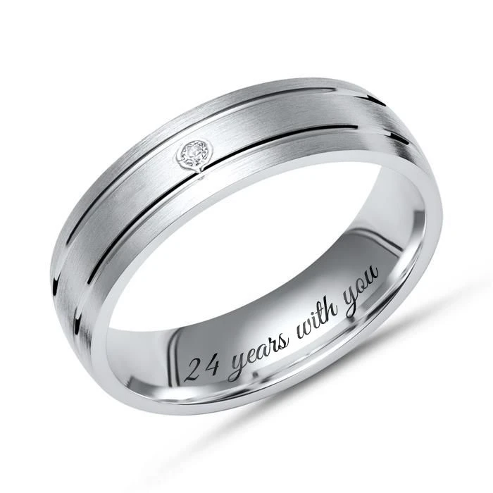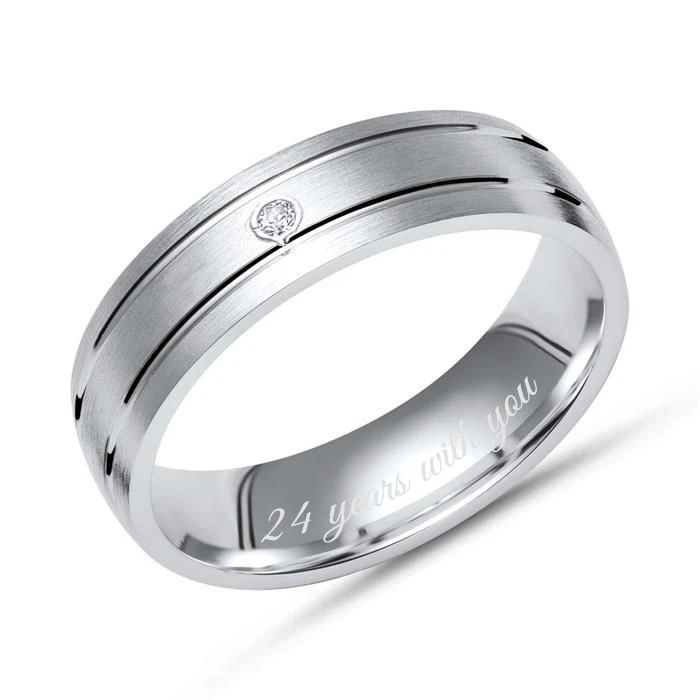 ElĂ©gante bague en argent massif 925 avec un zirkonium. La bague d’une largeur de 5mm est bombĂ©e Ă l’intĂ©rieur pour un plus grand confort. Personnalisez-la avec une date, un prĂ©nom ou encore un symbole grâce Ă la première gravure diamant offerte.