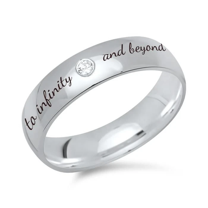 ElĂ©gante bague en argent massif 925 avec un zirkonium. La bague d’une largeur de 5mm est bombĂ©e Ă l’intĂ©rieur pour un plus grand confort. Profitez de la première gravure diamant offerte avec un nom, une date, ou encore un symbole.