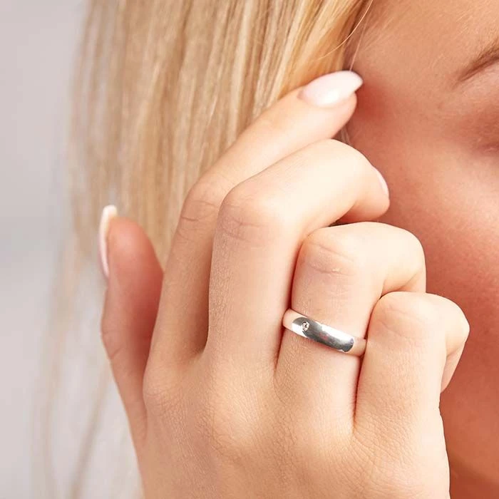 ElĂ©gante bague en argent massif 925 avec un zirkonium. La bague d’une largeur de 4mm est bombĂ©e Ă l’intĂ©rieur pour un plus grand confort.