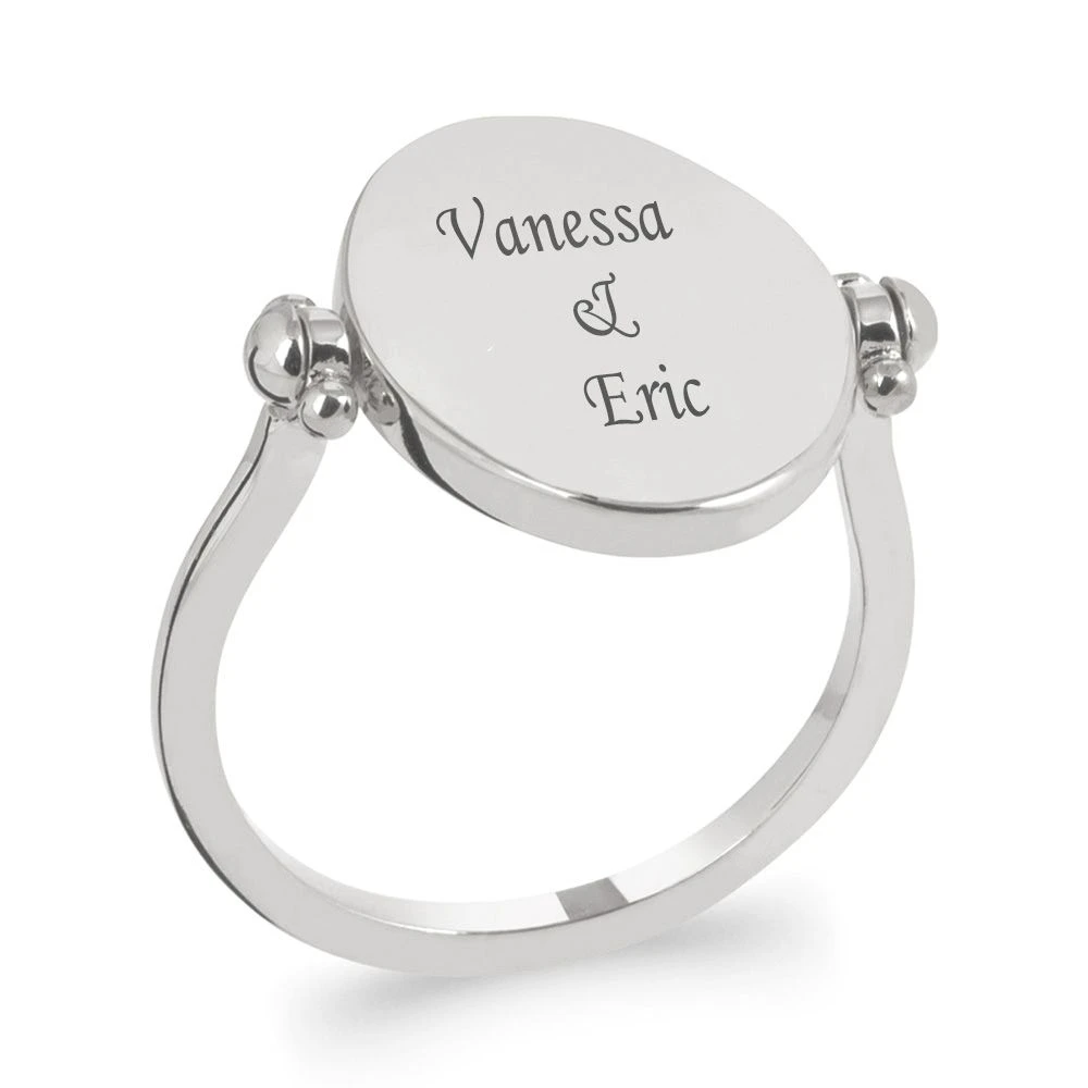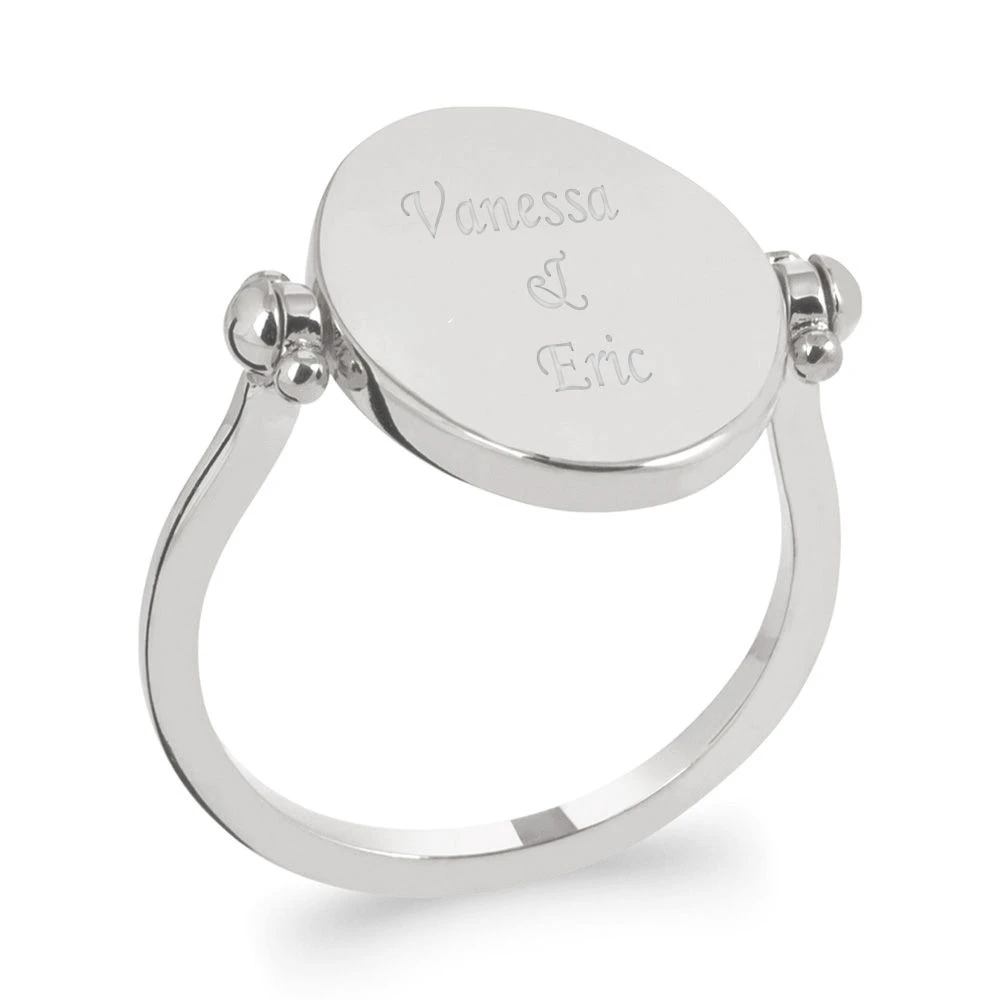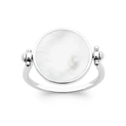 ElĂ©gante bague pivotante en argent avec sa pastille ronde nacrĂ©e. L’originalitĂ© de cette bague est sa possibilitĂ© de tourner pour faire apparaĂ®tre soit la face nacrĂ©e soit la face lisse gravĂ©e. La nacre a la particularitĂ© de faire circuler les Ă©nergies du corps et d’apaiser celle qui la porte. De plus ce bijou raffinĂ© embellira votre main. Profitez de la première gravure diamant offerte pour personnaliser le verso avec un symbole, un nom ou encore une date. C’est parfait comme cadeau Ă offrir ou pour se faire plaisir tout simplement. Une mĂ©daille assortie vendue sĂ©parĂ©ment complètera votre parure.