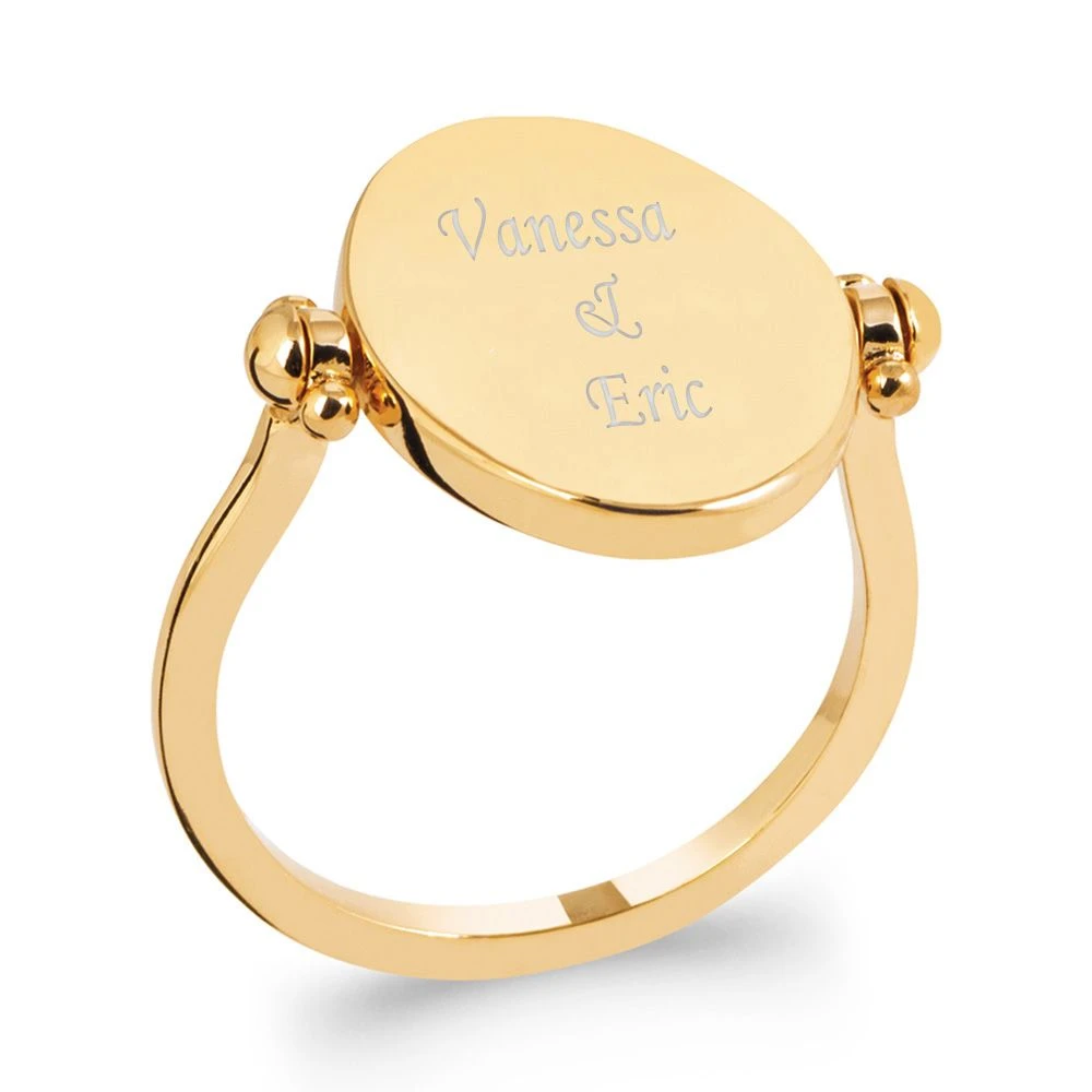 Elégante bague pivotante plaqué or 3 microns avec sa pastille ovale laquée noire. L’originalité de cette bague est sa possibilité de pivoter pour faire apparaître soit la face laquée soit la face lisse gravée. Ce bijou raffiné embellira votre main. Profitez de la première gravure diamant offerte pour personnaliser le verso avec un symbole, un nom ou encore une date. C’est parfait comme cadeau à offrir ou pour se faire plaisir tout simplement.