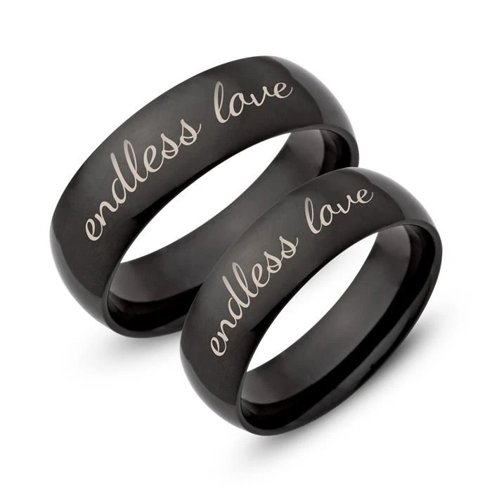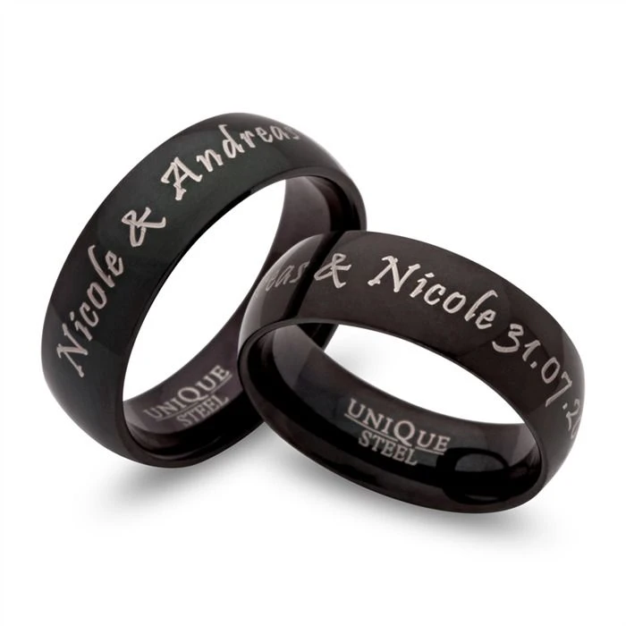 Modernes bagues duo noires en acier inoxydable. Les bagues d’une largeur de 7mm sont bombĂ©es Ă l’intĂ©rieur pour un plus grand confort. Personnalisez les avec une date et vos prĂ©noms grâce Ă la première gravure diamant offerte.