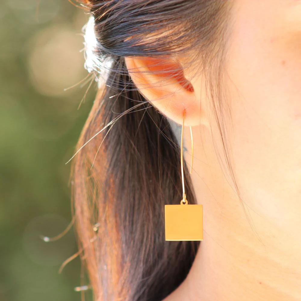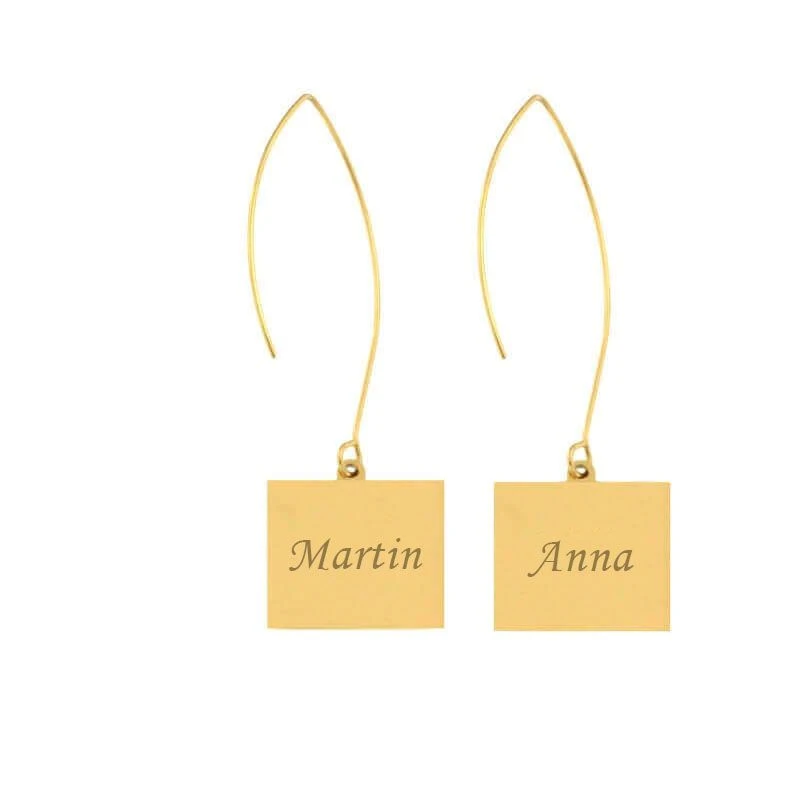 Jolies et modernes boucles d’oreilles forme carrĂ© en acier inoxydable dorĂ©. Elles peuvent ĂŞtre personnalisables au recto et au verso jusqu’Ă trois lignes au choix. La première gravure est offerte. C’est un cadeau idĂ©al pour faire plaisir.