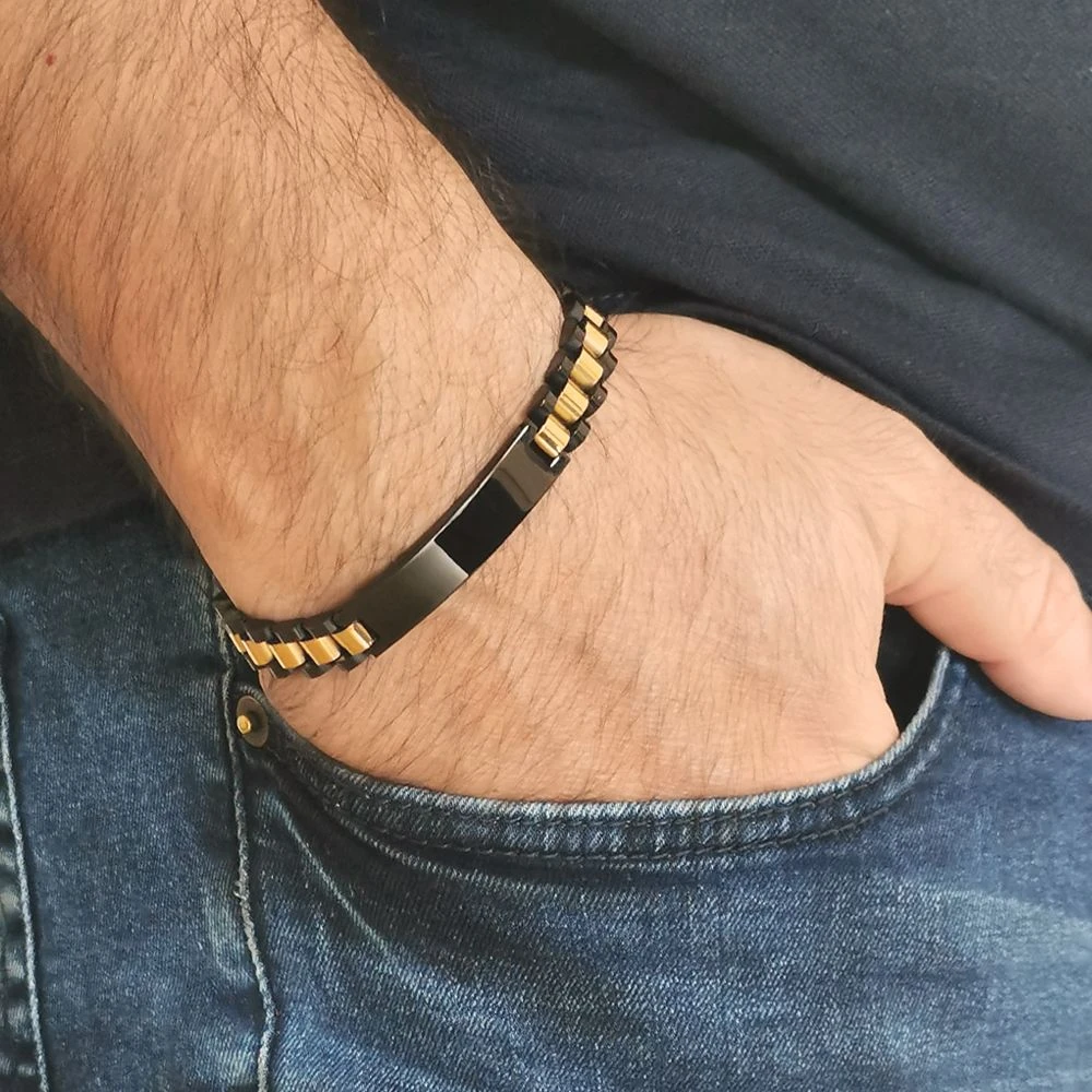 Cette gourmette en acier inoxydable noire allie style et modernité. Son centre doré lui confère un look clinquant, qui séduira les hommes. Vous pouvez retirer jusqu’à  3 cm (soit 4 maillons du bracelet) pour l’ajuster aux poignets plus fins. De plus, elle peut être personnalisée au recto et au verso selon vos préférences. N’hésitez pas à penser à vos proches ou à vous faire plaisir !
