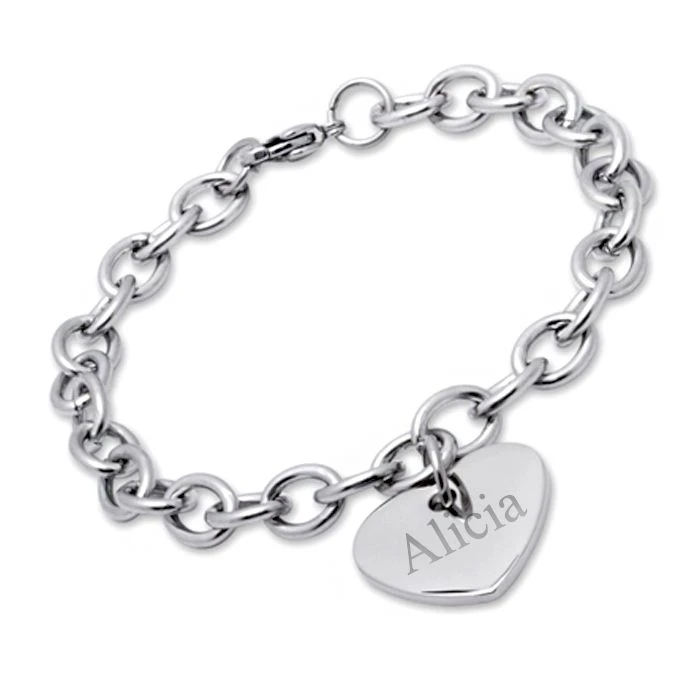 Original bracelet en acier inoxydable, il est agrĂ©mentĂ© d’un pendentif cĹ“ur. FĂ©minin et agrĂ©able Ă porter. La première gravure diamant est offerte.
