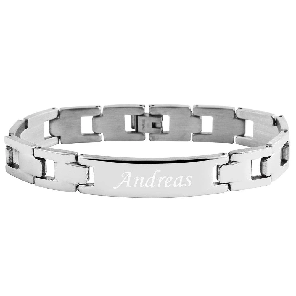 Moderne bracelet en acier inoxydable brossé et poli de 21 cm avec maillons espacés. Il est gravable au recto en 6 polices de style différent, la gravure diamant est offerte.