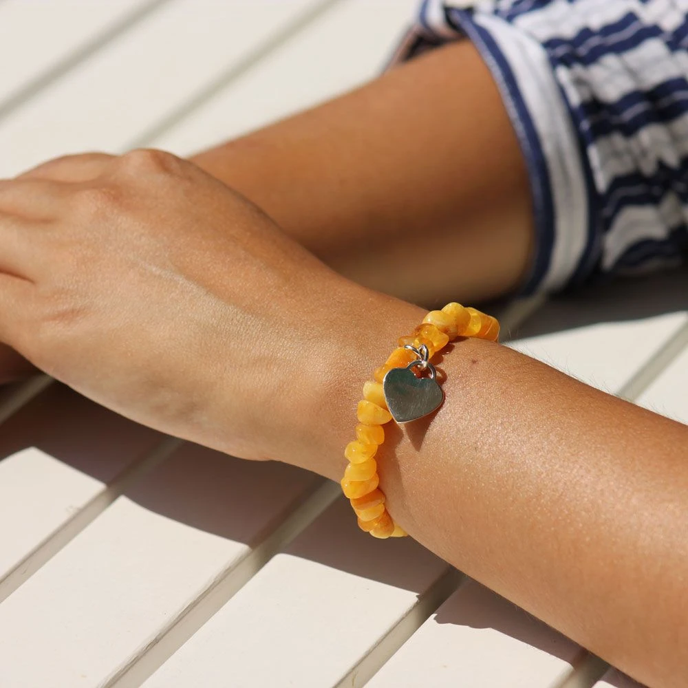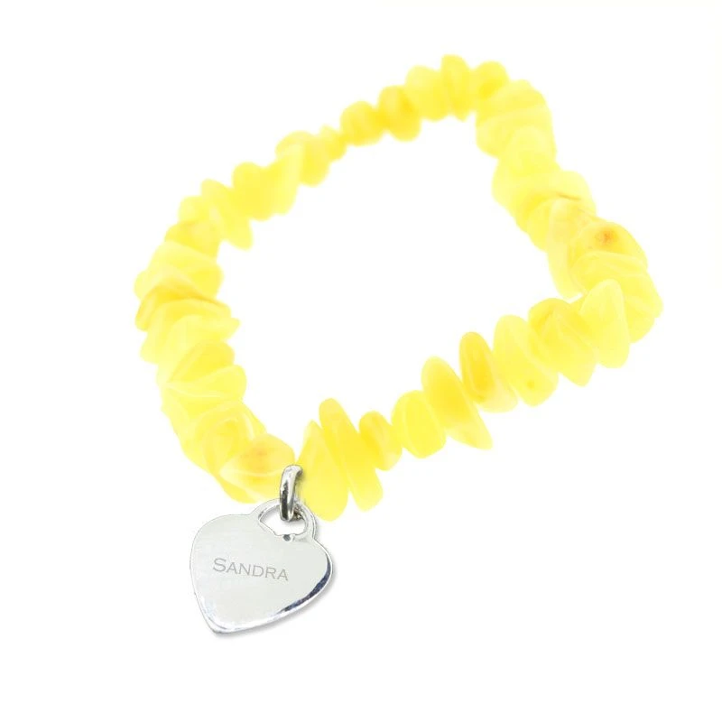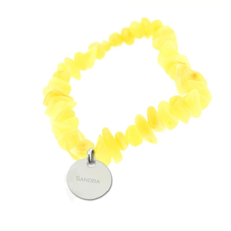 Adorable bracelet fin en Ă©clats vĂ©ritables d’ambre de couleurs claires avec breloque gravĂ©e en argent massif 925 au choix (coeur ou mĂ©daille ronde). Il est montĂ© sur fil extensible adaptable Ă tous poignets. Le pendentif est gravable sur les deux faces en 6 polices de style diffĂ©rent, la première gravure diamant est offerte. L’ambre a des vertus purifiantes et Ă©nergisantes.