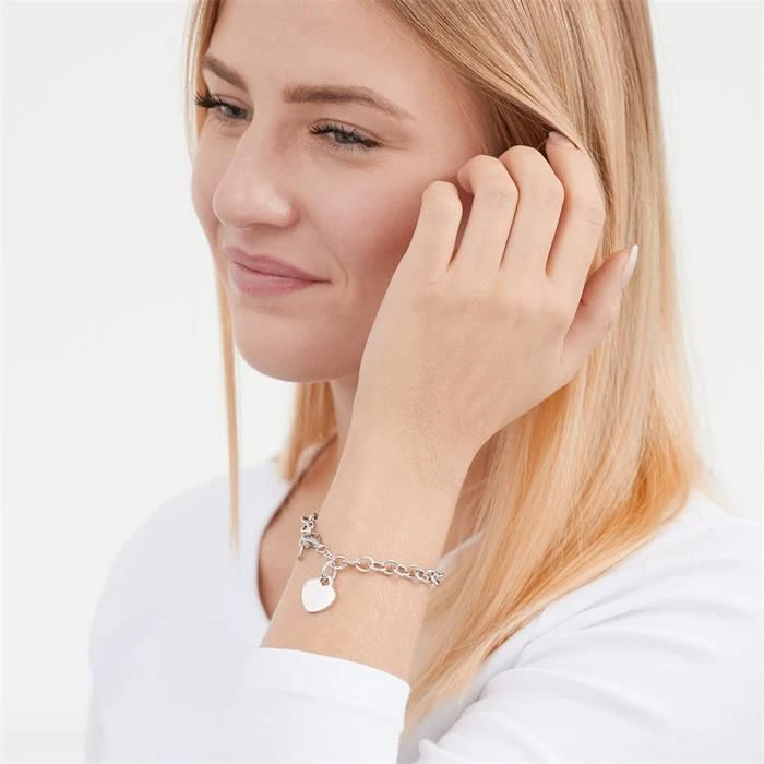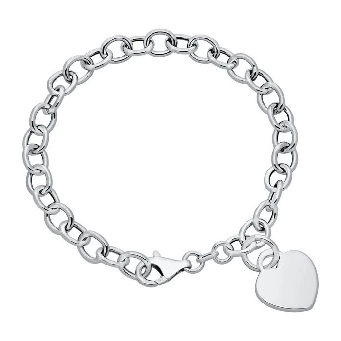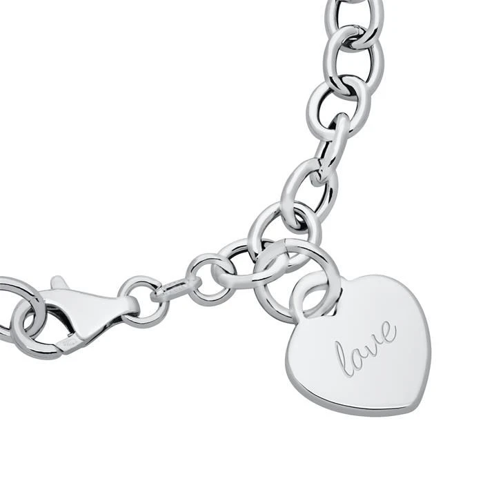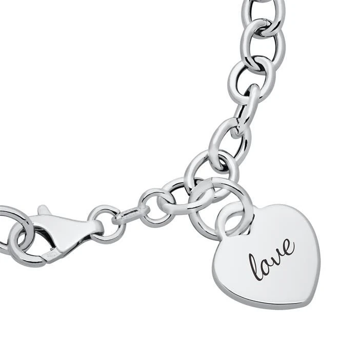 Cet Ă©lĂ©gant bracelet en argent massif 925 poli avec une breloque coeur gravable intĂ©grĂ©e Ă sa maille jaseron est rhodiĂ©, ce qui empĂŞche le ternissement. Le bracelet est dotĂ© d’un fermoir Ă mousqueton pour un plus grand confort. Profitez de la première gravure diamant gratuite avec un nom, une date, ou encore un symbole. C’est parfait comme cadeau Ă offrir ou pour se faire plaisir.Â