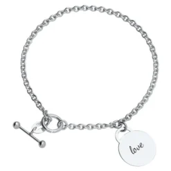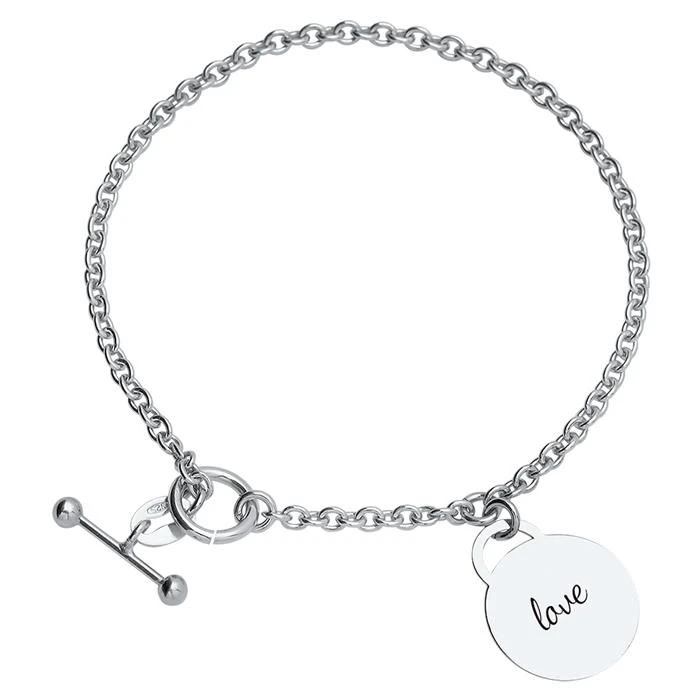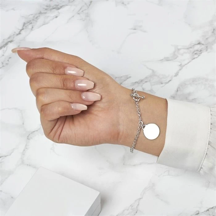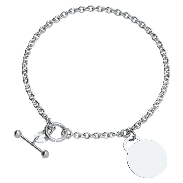 ElĂ©gant bracelet en argent 925 poli et rhodiĂ© avec une breloque ronde gravable intĂ©grĂ©e Ă la maille jaseron. Le rhodiage protègera votre bijou du ternissement. Le bracelet est dotĂ© d’un fermoir Ă bascule pour plus d’esthĂ©tisme. Profitez de la première gravure diamant gratuite avec un nom, une date, ou encore un symbole. C’est parfait comme cadeau Ă offrir ou pour se faire plaisir.