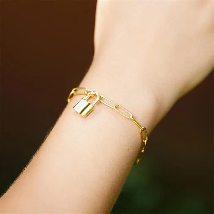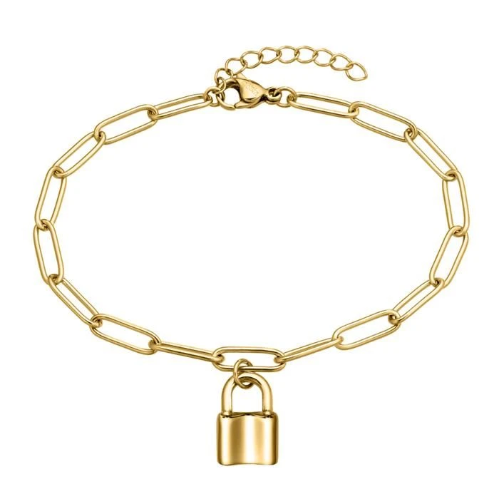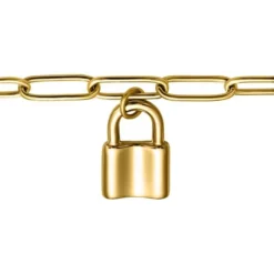 Joli bracelet avec sa breloque cadenas et sa chaine maille rectangle en acier doré de 18cm. Le cadenas est un symbole fort de longévité dans les unions. Le bracelet possède un fermoir mousqueton pour un plus grand confort et plus de sécurité. Profitez de la première gravure diamant offerte. Une extension intégrée à la chaîne du bracelet permet d’adapter la longueur d’environ 3 cm. C’est parfait comme cadeau à offrir à sa moitié ou pour se faire plaisir tout simplement.