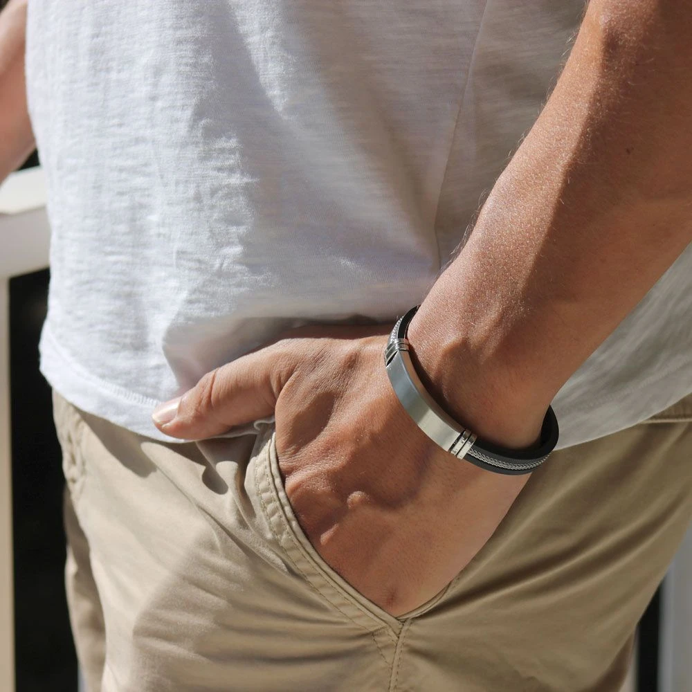 Superbe bracelet caoutchouc noir personnalisĂ©, classe et tendance Ă la fois. Un liserĂ© acier est intĂ©grĂ© au caoutchouc et fait le tour du bracelet ce qui le rend totalement unique. La plaque de gravure est en acier brossĂ© inoxydable, personnalisable au recto avec une gravure diamant ou laser au choix. DotĂ© d’une fermeture crochet très pratique pour plus de sĂ©curitĂ©. C’est un cadeau très sympa Ă offrir Ă un ami ou votre homme.