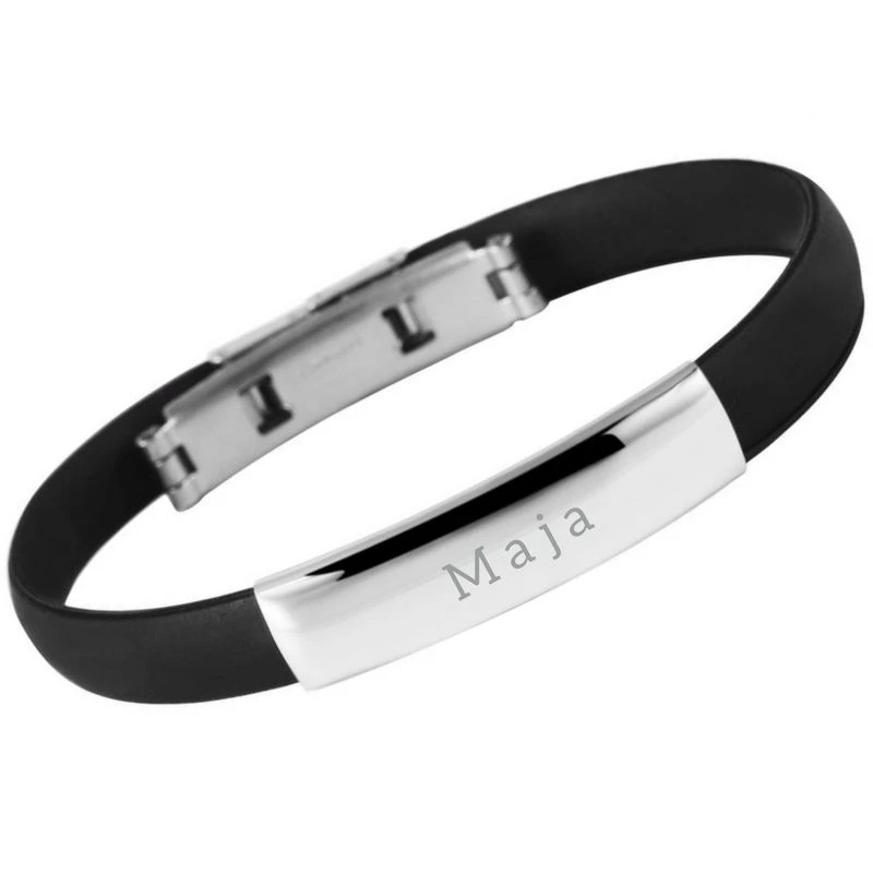 Moderne bracelet caoutchouc avec une plaque en acier inoxydable et un fermoir Ă clip pour un plus grand confort. La première gravure est offerte. C’est un joli cadeau Ă offrir pour une belle occasion.