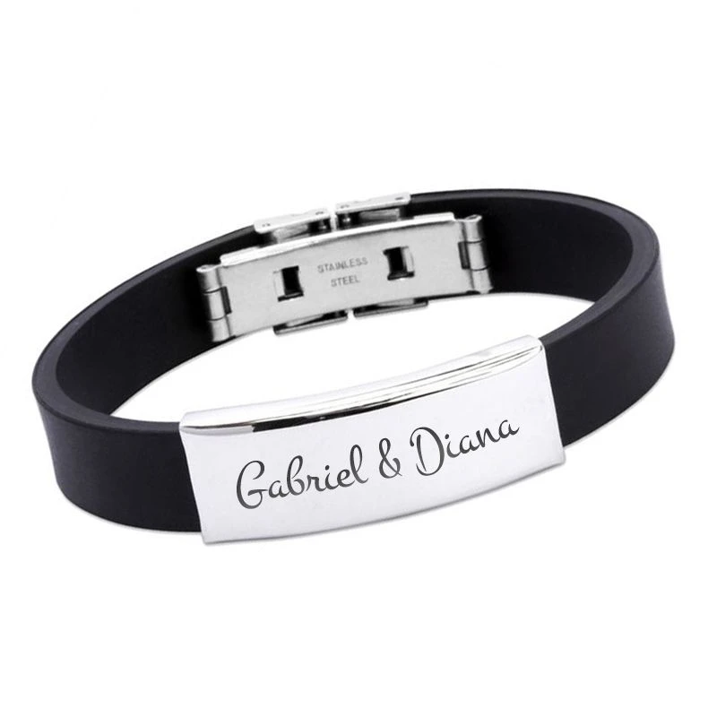 Moderne bracelet caoutchouc avec une plaque en acier inoxydable poli et un fermoir à boucle pliante double pour un plus grand confort. Profitez de la première gravure diamant gratuite avec un nom, une date, ou encore un symbole. C’est parfait comme cadeau à offrir ou pour se faire plaisir.