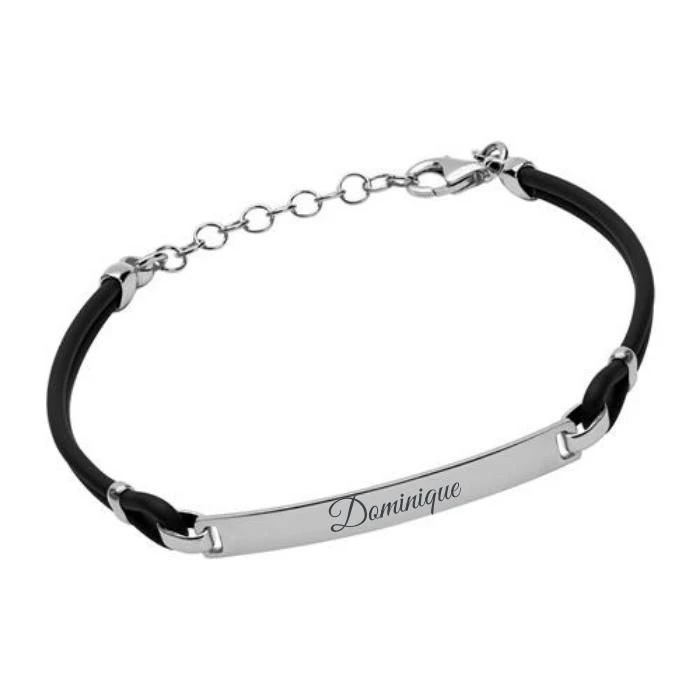 Moderne bracelet en caoutchouc avec sa plaque rectangulaire gravable en argent 925 poli. Le bracelet est dotĂ© d’un fermoir mousqueton pour un plus grand confort. Une extension intĂ©grĂ©e au bracelet permet d’adapter la longueur du bracelet d’environ 3 cm. Profitez de la première gravure diamant gratuite avec un nom, une date, ou encore un symbole. C’est parfait comme cadeau Ă offrir ou pour se faire plaisir.