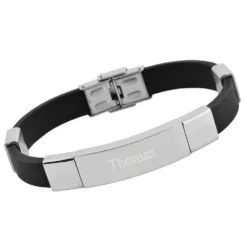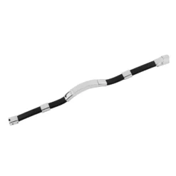 Moderne et Ă©lĂ©gant bracelet caoutchouc et acier inoxydable avec des attaches en acier poli et une plaque d’identitĂ© gravable. La gravure recto diamant est offerte au choix parmi 6 polices de style diffĂ©rent. Le bracelet est facilement ajustable en longueur.
