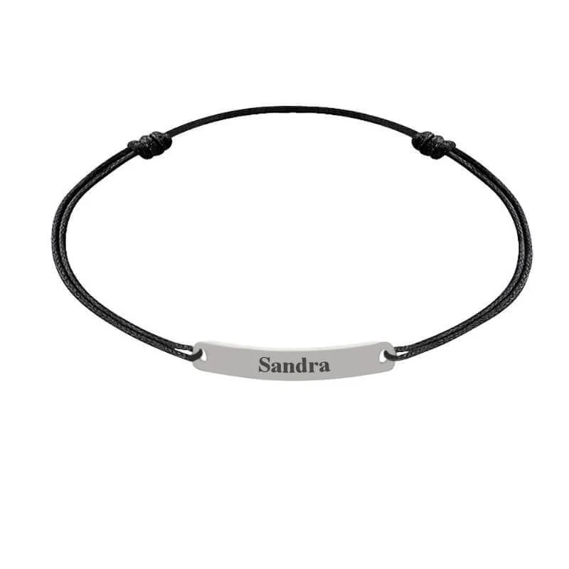 Très sympa bracelet cordon noir avec sa plaque de gravure en argent 925, personnalisable au recto/verso avec une gravure diamant offerte. Grâce aux deux nĹ“uds coulissants de part et d’autre de la plaque de gravure, la taille est rĂ©glable. C’est un cadeau idĂ©al pour une jeune femme ou un enfant.