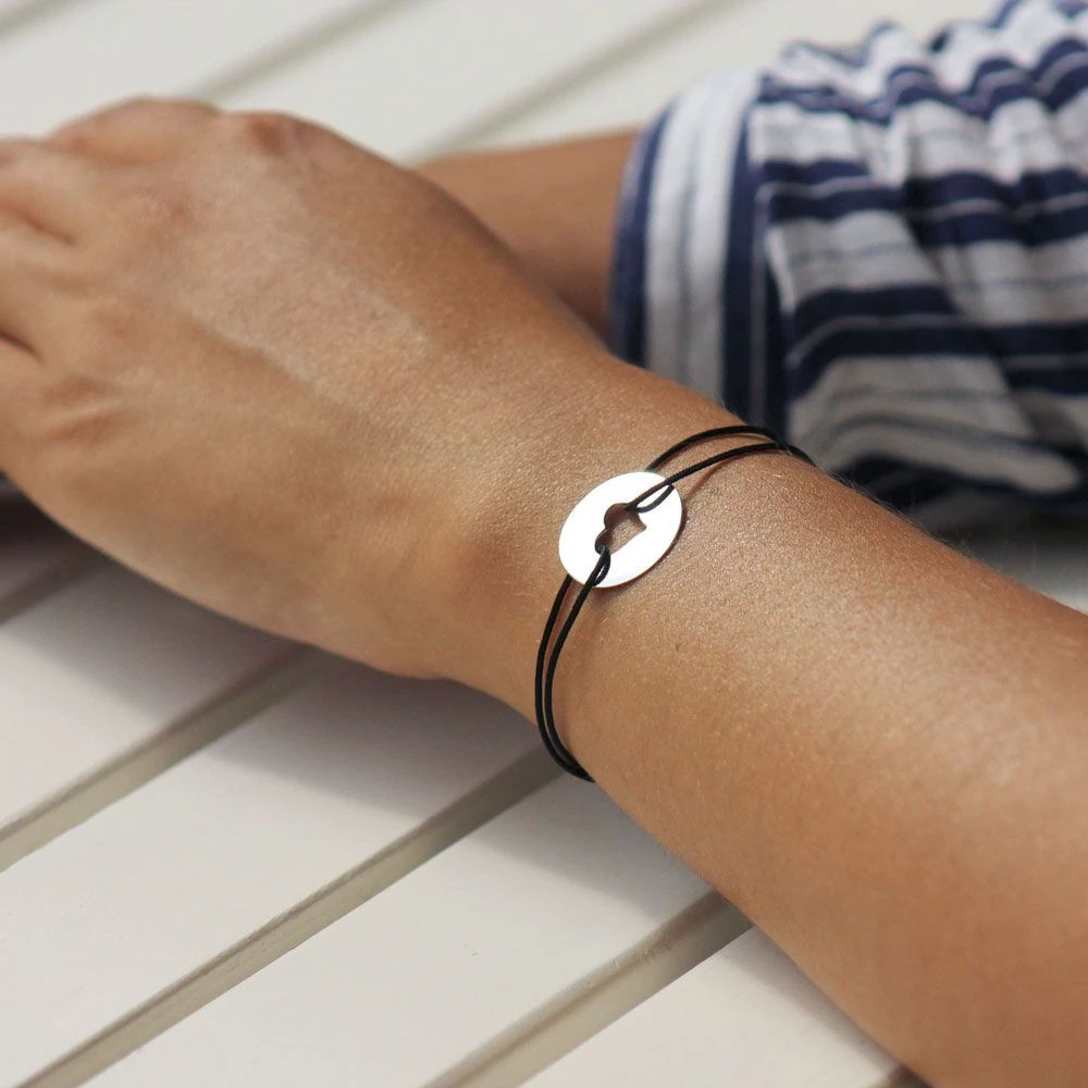 Très joli bracelet cordon noir agrĂ©mentĂ© d’un jeton percĂ© d’un cĹ“ur en argent très raffinĂ©. Le disque jeton est discret et très Ă©lĂ©gant au poignet. Grâce aux deux nĹ“uds coulissants de part et d’autre du jeton, la taille est rĂ©glable. C’est une idĂ©e cadeau très sympa pour une femme ou un enfant que l’on affectionne.