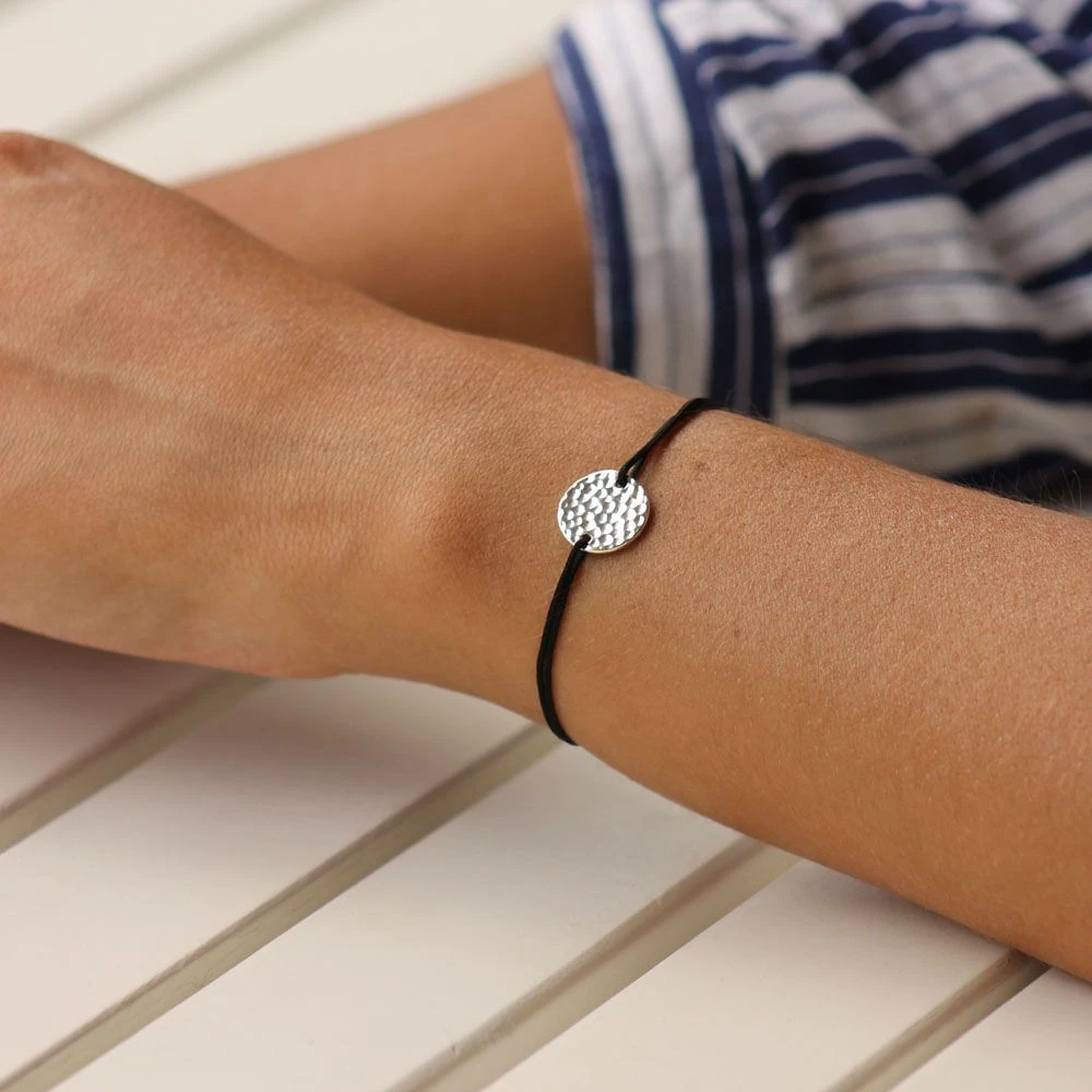 Superbe bracelet cordon noir agrĂ©mentĂ© d’un disque martelĂ© en argent très raffinĂ©. Le disque jeton est discret et très Ă©lĂ©gant au poignet. Grâce aux deux nĹ“uds coulissants de part et d’autre du jeton, la taille est rĂ©glable. C’est une idĂ©e cadeau très sympa Ă offrir pour une belle occasion.