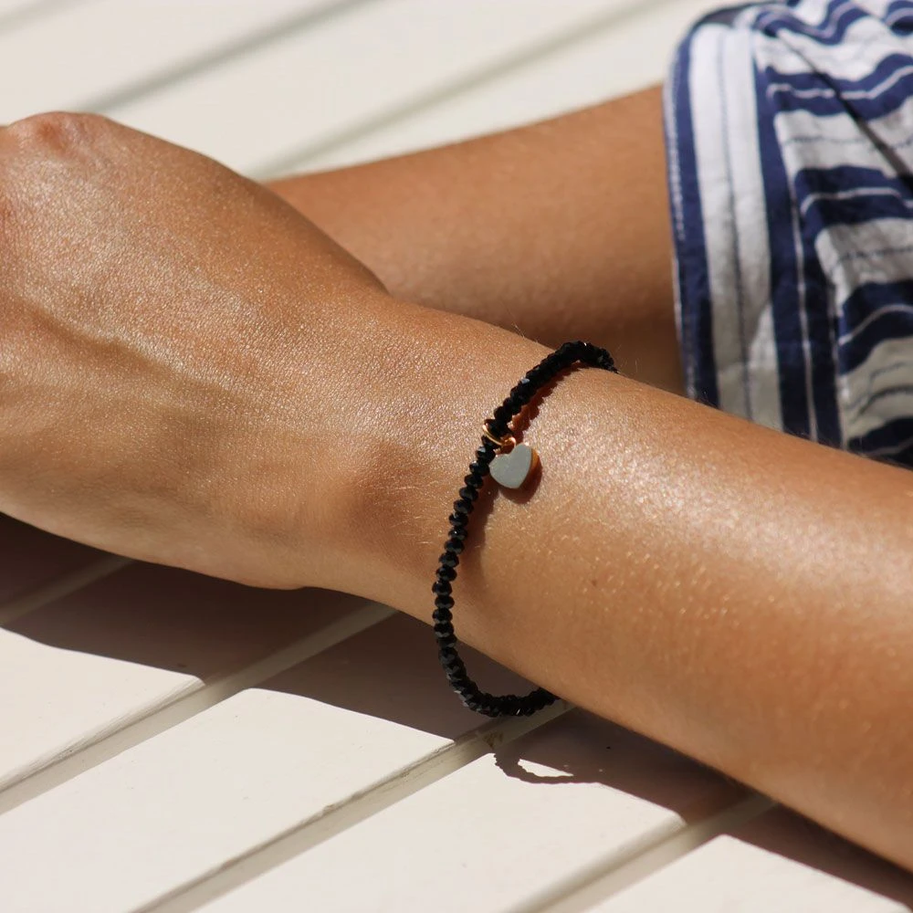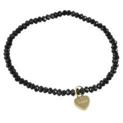 Adorable bracelet en pierre noire taillée façon « cristal » avec son petit cœur en acier doré gravable 2 caractères. La gravure diamant est offerte.