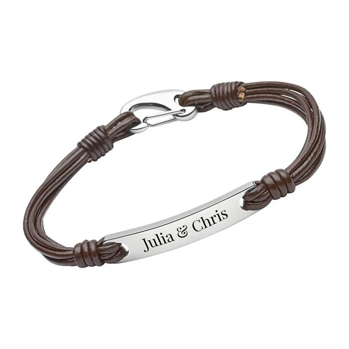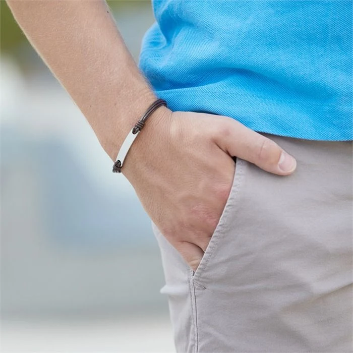 Bracelet décontracté composé de plusieurs lanières en cuir marron avec sa plaque en acier à graver. Le bracelet en cuir possède un fermoir mousqueton facile à manipuler. Profitez de la première gravure diamant gratuite avec un nom, une date, ou encore un symbole. C’est parfait comme cadeau à offrir ou pour se faire plaisir. Le bracelet est disponible en différentes longueurs.