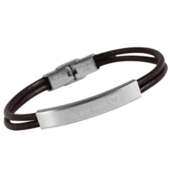 Joli bracelet en cuir marron composĂ© de deux brins et sa plaque de gravure en acier inoxydable. Ce bracelet est personnalisable au recto avec la gravure diamant offerte. C’est un cadeau unique pour de nombreuses occasions.