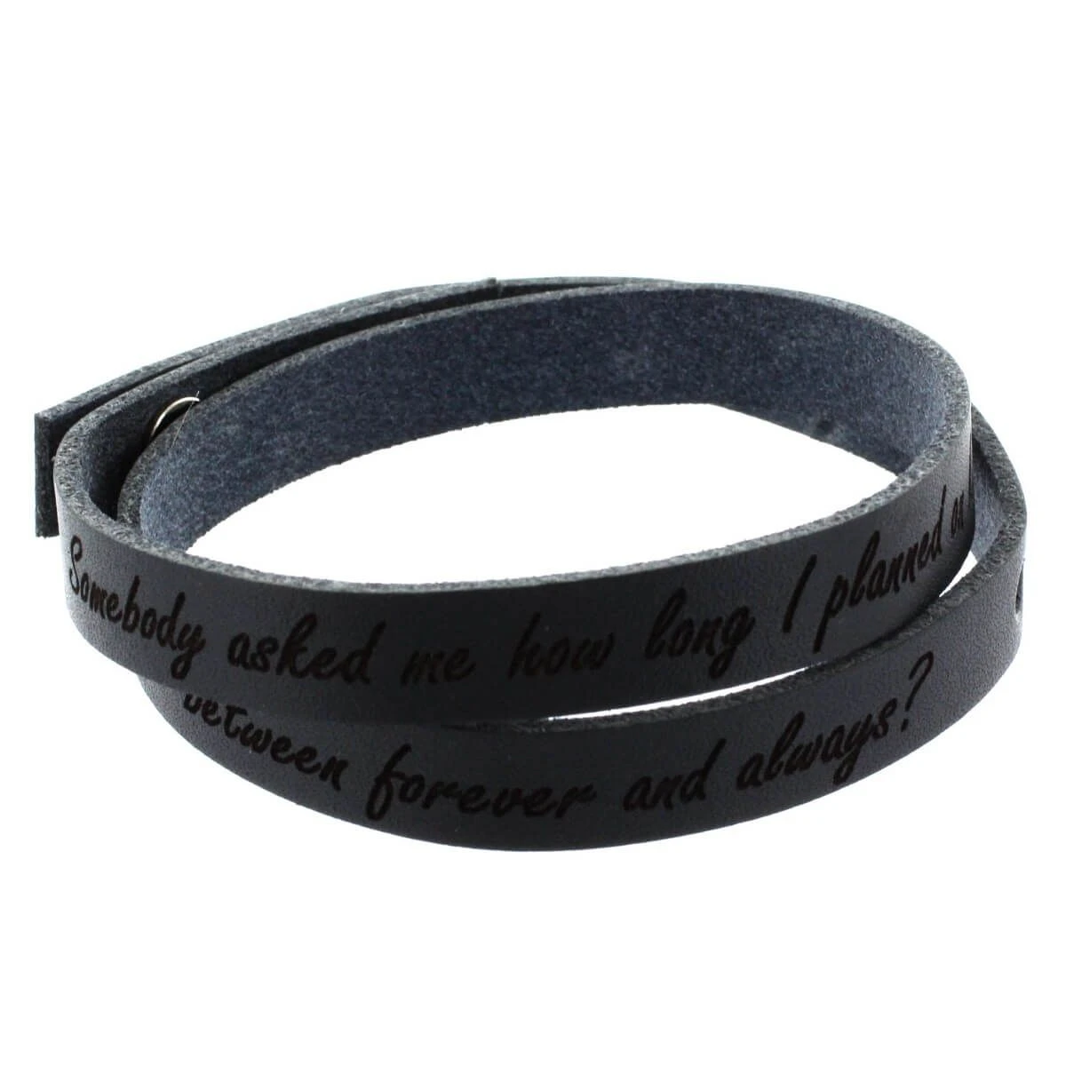 Moderne bracelet en cuir noir multirang personnalisable avec une gravure laser offerte. Comporte une fermeture style « boule » qui assure une belle sĂ©curitĂ© et permet de le rendre adaptable Ă chaque poignet. Ce bracelet cuir noir s’enroule facilement autour du poignet grâce Ă un cuir souple de haute qualitĂ©. DĂ©clarez vos sentiments avec une longue phrase ou pensez mĂŞme Ă une jolie citation, jusqu’Ă 150 caractères possible. C’est un cadeau unique et personnel pour les hommes et les femmes.