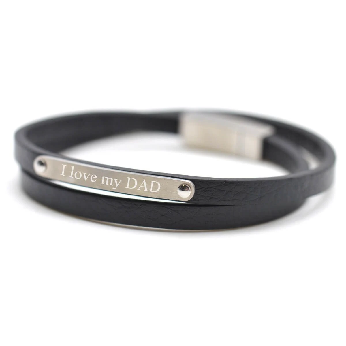 Très sympa bracelet multirang (2 tours) en cuir noir avec sa plaque de gravure en acier inoxydable mate. Ce bracelet est très agrĂ©able Ă porter et personnalisable au recto avec la gravure diamant offerte. C’est un cadeau magnifique Ă offrir pour un homme que l’on admire.
