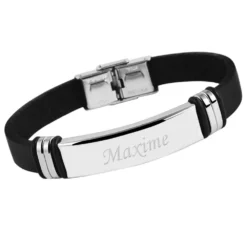 Moderne bracelet en cuir noir avec sa plaque de gravure en acier inoxydable. Ce bracelet est personnalisable au recto avec la gravure diamant offerte. C’est un cadeau unique pour de nombreuses occasions. Un homme actif apprĂ©ciera ce joli geste.