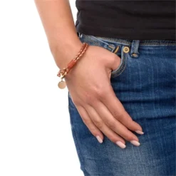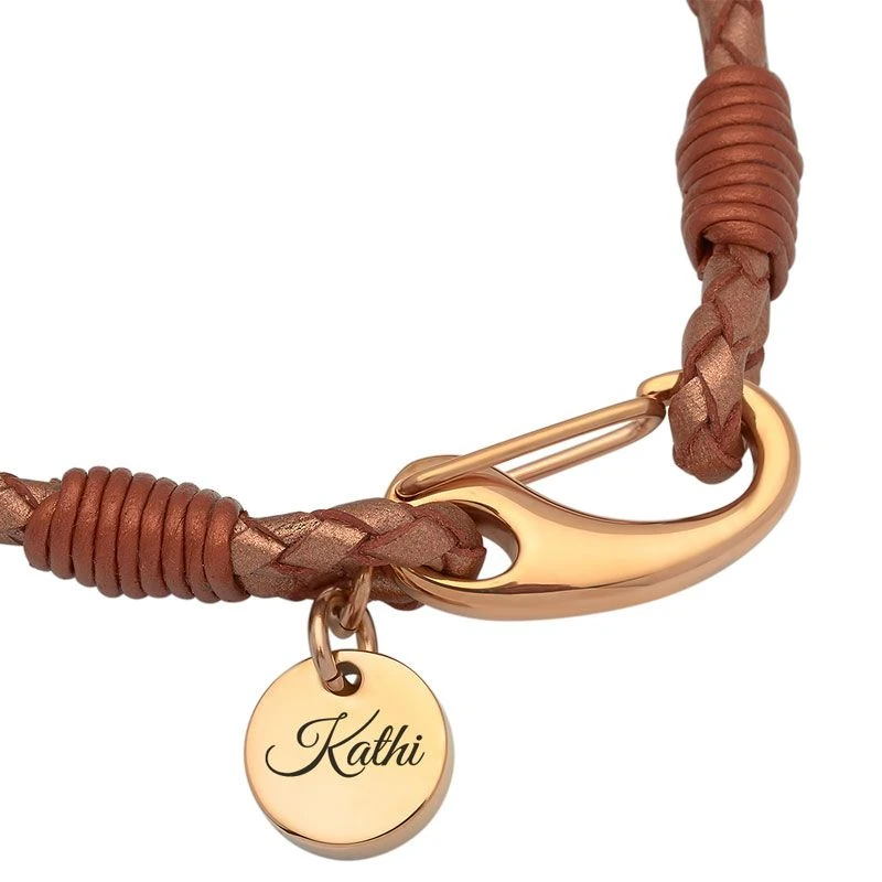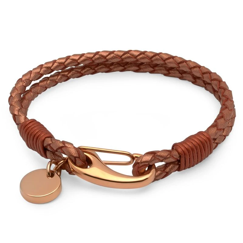 Bracelet chic avec une double lanière tressĂ©e en cuir mordorĂ©, agrĂ©mentĂ© d’une mĂ©daille ronde en acier rosĂ©. Son fermoir mousqueton au look vintage permet une plus grande sĂ©curitĂ©. Profitez de la première gravure diamant gratuite avec un nom, une date, ou encore un symbole. C’est parfait comme cadeau Ă offrir ou pour se faire plaisir.