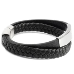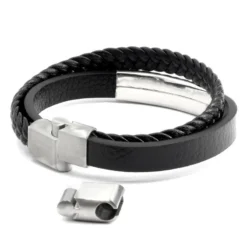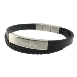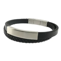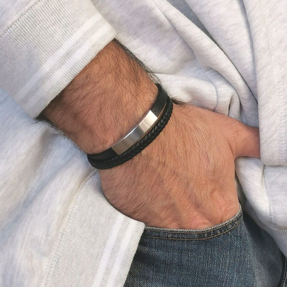 A la fois Ă©lĂ©gant et masculin, ce bracelet en cuir est un incontournable pour les hommes modernes. Il est composĂ© d’une bride de cuir tressĂ©e et d’une bride droite. C’est sur cette dernière que se trouve sa plaque de gravure en acier brossĂ© au fini mat. Il est vendu avec une extension qui lui permettra de se rallonger d’un centimètre afin de s’adapter Ă un plus grand nombre de poignets. A vous de le rendre unique selon vos envies.