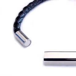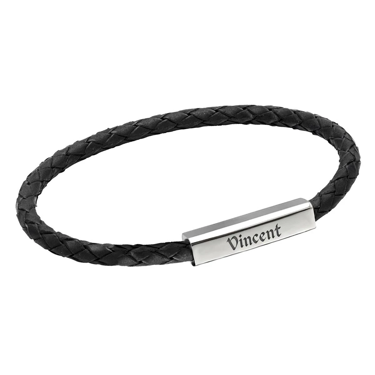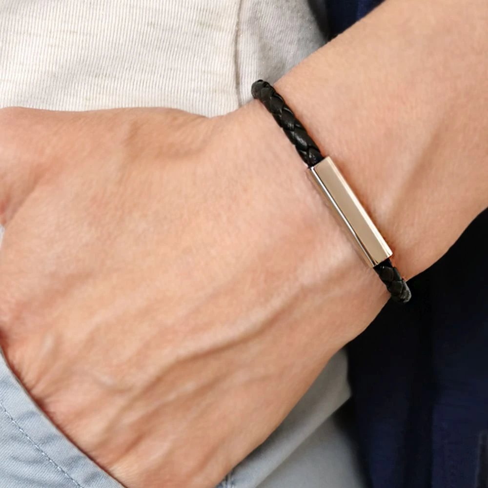 Bracelet en cuir noir de style raffinĂ© et moderne, avec un fermoir en acier inoxydable magnĂ©tique qui s’accorde parfaitement Ă tous les poignets avec ses 3 longueurs disponibles au choix: 17, 19 et 21 cm. Ce bracelet se compose d’un unique brin tressĂ©. Il se distingue par un fermoir avec les quatre faces gravables ce qui lui donne un look totalement unique. La première gravure diamant est offerte, c’est un superbe cadeau Ă faire pour toute occasion.