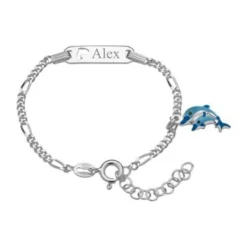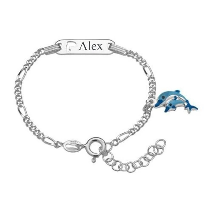 Mignon bracelet gourmette enfant en argent 925 poli avec une mĂ©daille breloque double dauphin Ă©maillĂ©e bleue intĂ©grĂ©e Ă une jolie maille figaro et une plaque rectangulaire gravable ajourĂ©e d’un petit dauphin. La gourmette est dotĂ©e d’un fermoir Ă anneau Ă ressort. Une extension intĂ©grĂ©e Ă la gourmette permet d’adapter la longueur du bracelet d’environ 3 cm. Profitez de la première gravure diamant gratuite avec un nom, une date, ou encore un symbole. Faites plaisir Ă un enfant en offrant cette jolie gourmette personnalisĂ©e Ă l’occasion d’un anniversaire, de NoĂ«l ou d’une fĂŞte.