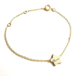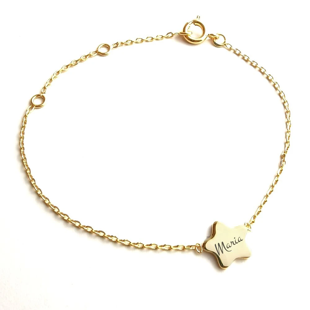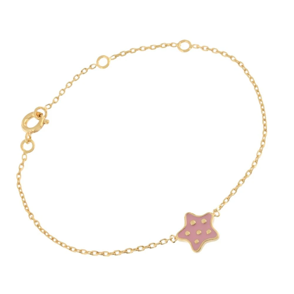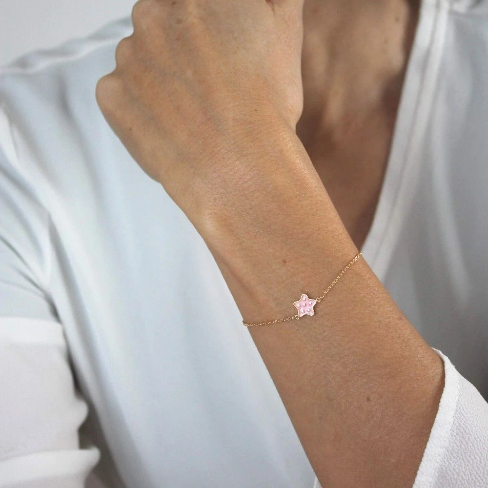 La petite étoile émaillée rose constellée de points dorés de cet irrésistible bracelet magnifiera les petits poignets. Grâce aux 3 bélières de différentes tailles du bracelet plaqué or, ce bijou évolutif sera le compagnon dans la durée de votre enfant. Personnalisable au verso avec un petit nom ou une date, ce bracelet étoile sera unique. Offrez sans hésiter ce précieux cadeau personnalisé avec la première gravure diamant offerte.