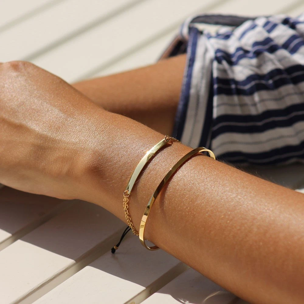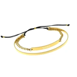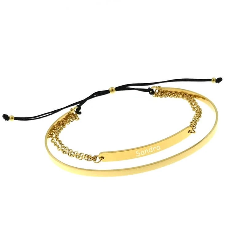 Magnifique bracelet en acier doré inoxydable composé d’un jonc sur lequel est relié une gourmette acier doré à 2 chaînettes. La plaque de la gourmette est personnalisable au recto/verso avec une première gravure diamant offerte. Le bracelet jonc est réglable avec très jolie fermeture cordon noir. permettant de l’ajuster confortablement au poignet. Vous ne vous tromperez pas en offrant ce cadeau à une femme d’exception.